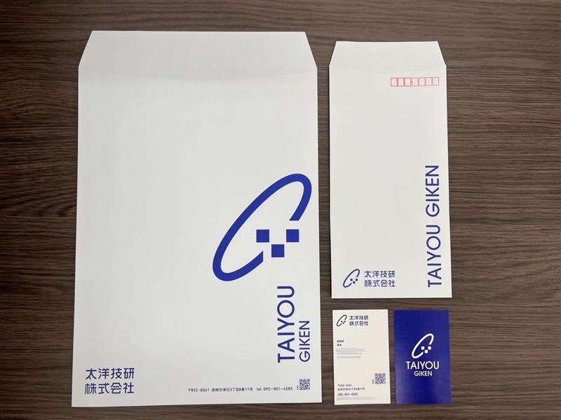 また、名刺や封筒も新しいビジュアルコンセプトに合わせて新しくなりました。webサイトも含めて、同じトーンで統一したことで、一目で「太洋技研だ!」と分かっていただけるような、まとまりのあるデザインに仕上がりました。