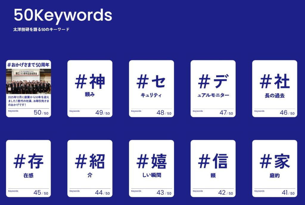50周年にちなみ、「太洋技研を語る50のキーワード」として、弊社の技術、歴史、社風を紐解く50の言葉を集めました。カーソルを合わせると裏面が現れます。楽しい内容盛りだくさんなので、ペラっとめくってみてください!
